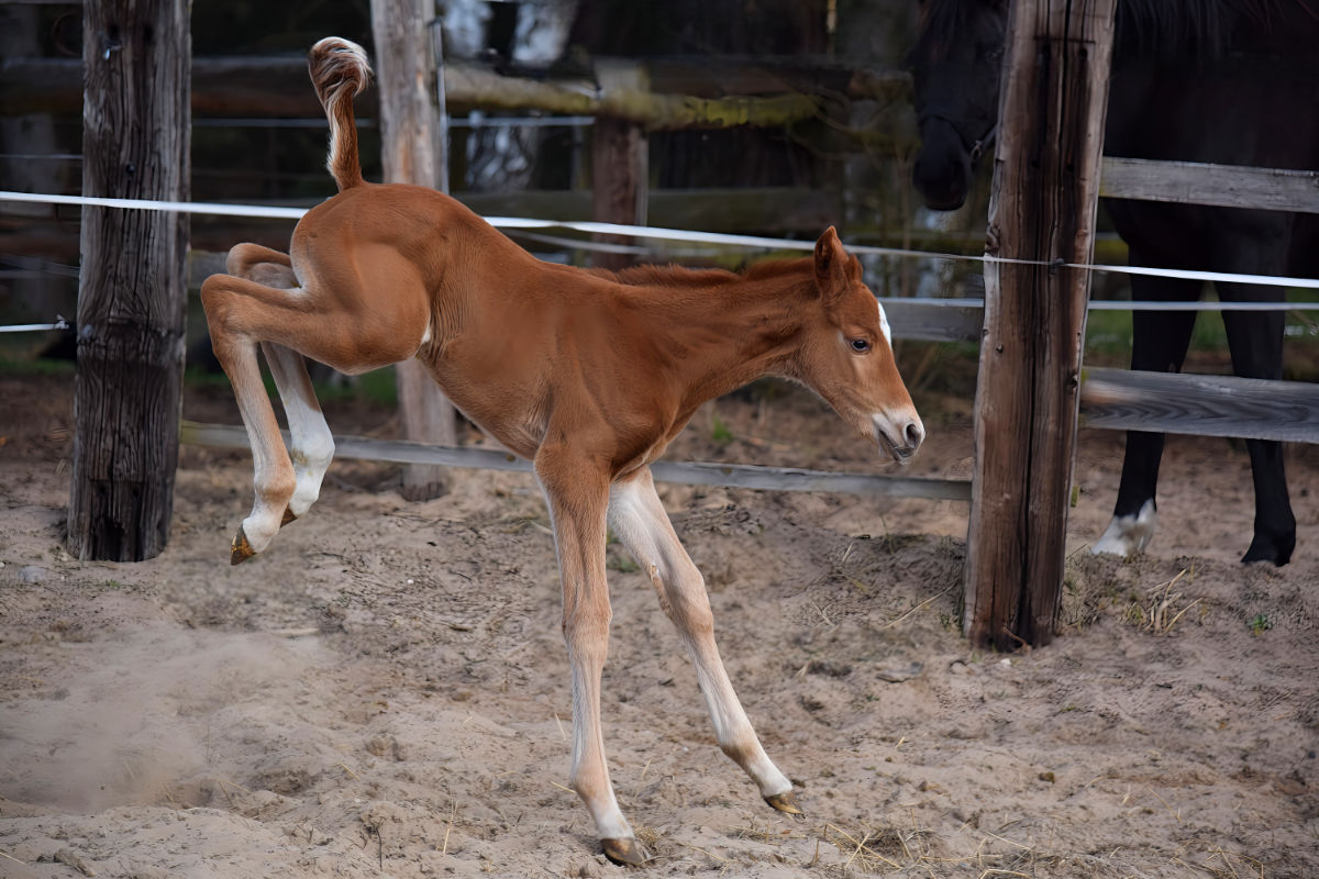 Am vergangenen Mittwoch durften wir zur züchterfreundlichen Zeit um 7:30 das zweite Fohlen unserer St.Pr.St. Fabiola (Imperio x Millennium) begrüßen. Das großgewachsene Stutfohlen stammt ab von Zauberdeyk und ähnelt phänotypisch sehr ihrem Vater. Die Geburt verlief wie auch im letzten Jahr problemlos und Fabiola kümmert sich liebevoll um ihren Nachwuchs.
